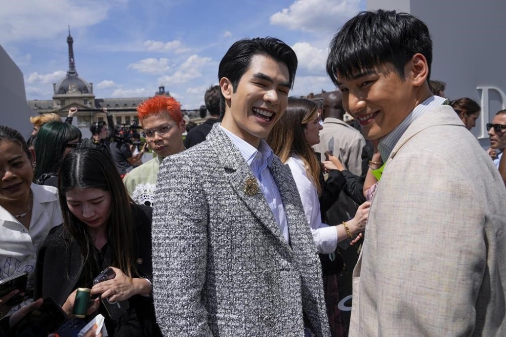 Nattawin Wattanagitiphat, left, and Mile Phakphum Romsaithong upon arrival at the Dior Menswear Spring/Summer 2024 fashion collection presented in Paris, Friday, June 23, 2023. (AP Photo/Michel Euler)