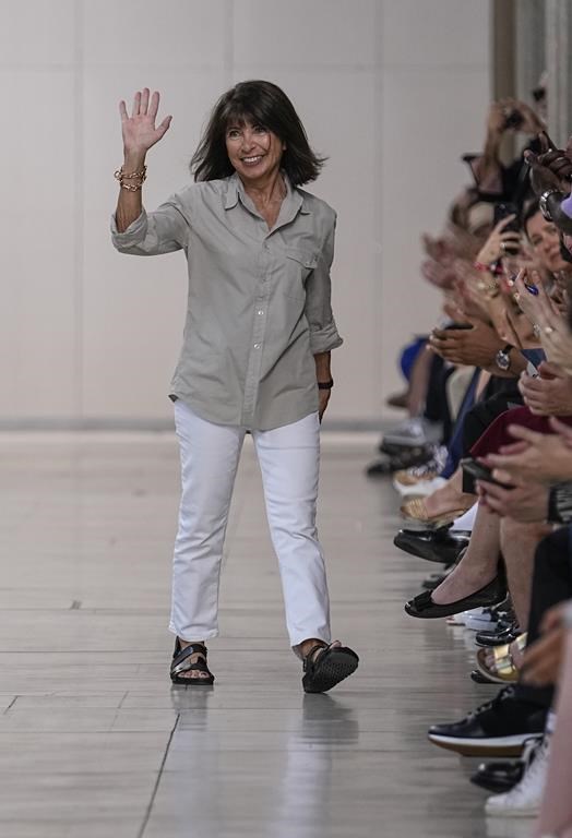 Designer Veronique Nichanian accepts applause after the conclusion of the Hermes Menswear Spring/Summer 2024 fashion collection presented in Paris, Saturday, June 24, 2023. (AP Photo/Michel Euler)