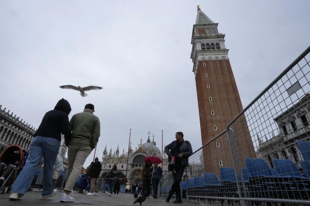 People walk next to seats placed ahead of Pope Francis' visit on Sunday in St. Mark Square, in Venice, Italy, Saturday, April 27, 2024. (AP Photo/Antonio Calanni)