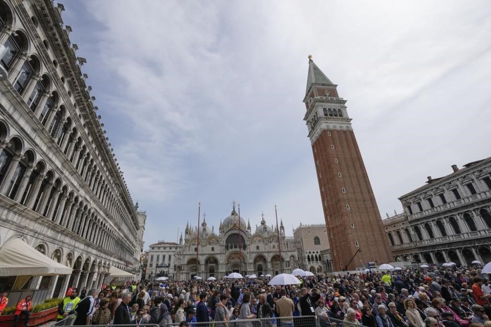 Faithful gather in St. Mark's Square, during a mass celebrated by Pope Francis in Venice, Italy, Sunday, April 28, 2024. The Pontiff arrived for his first-ever visit to the lagoon town including the Vatican pavilion at the 60th Biennal of Arts. (AP Photo/Antonio Calanni)