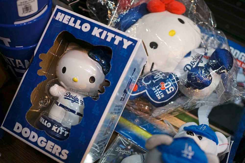 The 50th anniversary Hello Kitty dolls with Los Angeles Dodgers uniform are sold at a shop Wednesday, Oct. 23, 2024 in Tokyo. (AP Photo/Eugene Hoshiko)