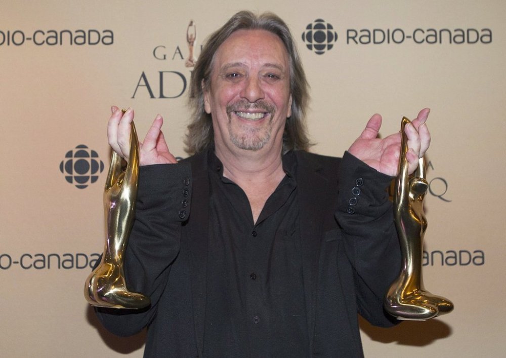Serge Fiori holds up his Felix award for best adult contempory album at the gala Adisq awards ceremony in Montreal, Sunday, October 26, 2014. THE CANADIAN PRESS/Graham Hughes