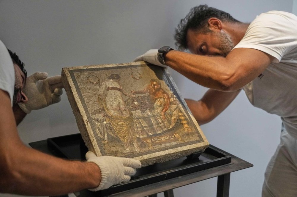 POMPEII, Italy (AP) — A mosaic panel on travertine slabs, depicting an erotic theme from the Roman era, was returned to the archaeological park of Pompeii on Tuesday, after being stolen by a Nazi German captain during World War II.