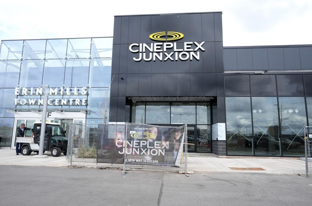 The exterior of Cineplex Junxion Erin Mills is shown in Mississauga, Ont., on Monday, April 24, 2023. The competition commissioner says moviegoers don’t have a way to avoid Cineplex’s online booking fees, which constitute “drip pricing” considered a harmful practice under the law. THE CANADIAN PRESS/Nathan Denette