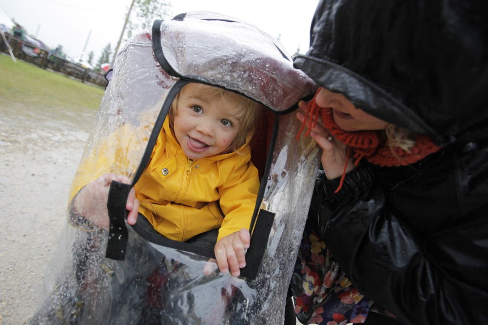 John Woods / Winnipeg Free Press Miriam Recksiedler and her mom Jillian check to see if the rain has stopped as music fans cover up on a very wet final day of Folk Fest Sunday, July 13, 2014.