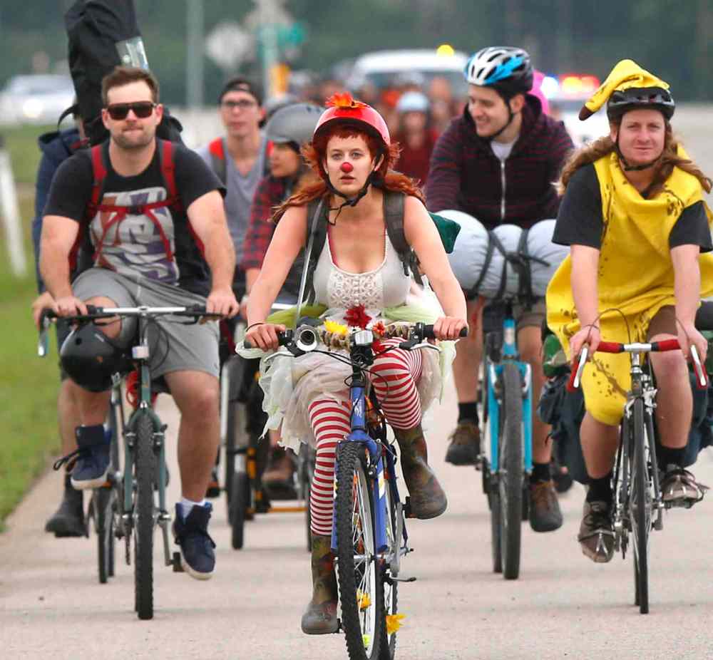 Festival-goers started cycling out at 5:45 a.m. and 6 a.m. from the Forks. About 250 cyclists are registered to take part. The line of cyclists pedalled on the shoulder of Highway 59.