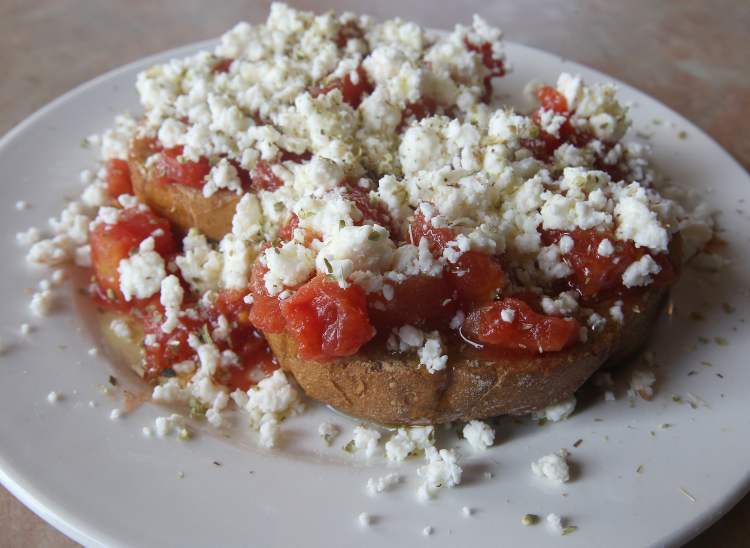That was the Ntako salad, the description of which is reminiscent of the Italian panzanella bread salad. But (although you may need to eat it with a knife and fork) this one isn’t really a salad, but more like a bruschetta, based on a rusk that is topped by juicy, ripe tomatoes, sprinkled with mild feta, moistened by olive oil and seasoned with oregano ($6.99). I tried it twice to be sure it was as delicious as it had been on my first visit, and it was.