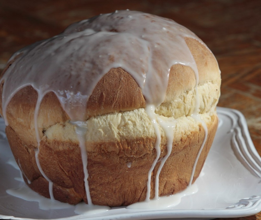 Tester’s notes: I used the “sweet bread” setting, selecting the small size (1.5 lb) and medium-brown designations. If the bread seems to be baking quickly, you can stop the baking process earlier. I found my crust was a little tough — though that could my inexperience with the bread maker — but the bread was tender and had a lovely, subtle taste from the lemon. This version is very easy, the drawback being that it doesn’t have the traditional paska shape.