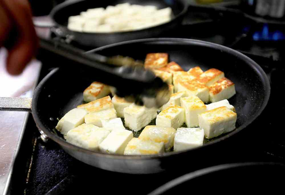 Add ghee to a large nonstick pan on medium heat. Place paneer cubes in the hot ghee fry, just until the bottoms are light golden-brown. Turn with a spatula to brown on the other side. They don’t need to be browned on all sides. Transfer to a plate or a bowl and set aside until needed.