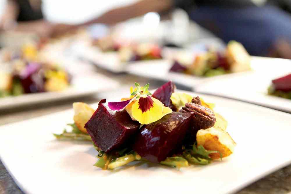 In a large bowl, toss dandelion greens with masala roasted tomato vinaigrette, place a small handful in the center of a plate or bowl. Top with roasted beets, fried paneer, and candied pecans, drizzle more dressing if you desire.