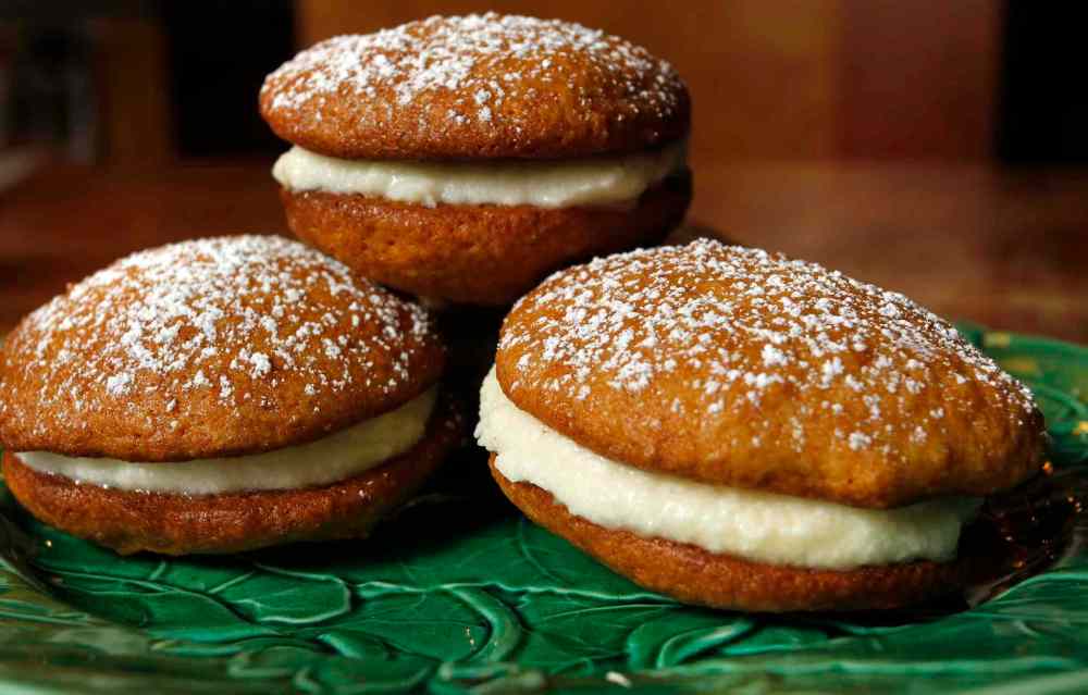 Tester’s notes: This is a nice seasonal take on the whoopie pie. Don’t worry about getting the cake-like batter into perfect rounds: The cookies will spread quite a bit and become more or less round as they bake.