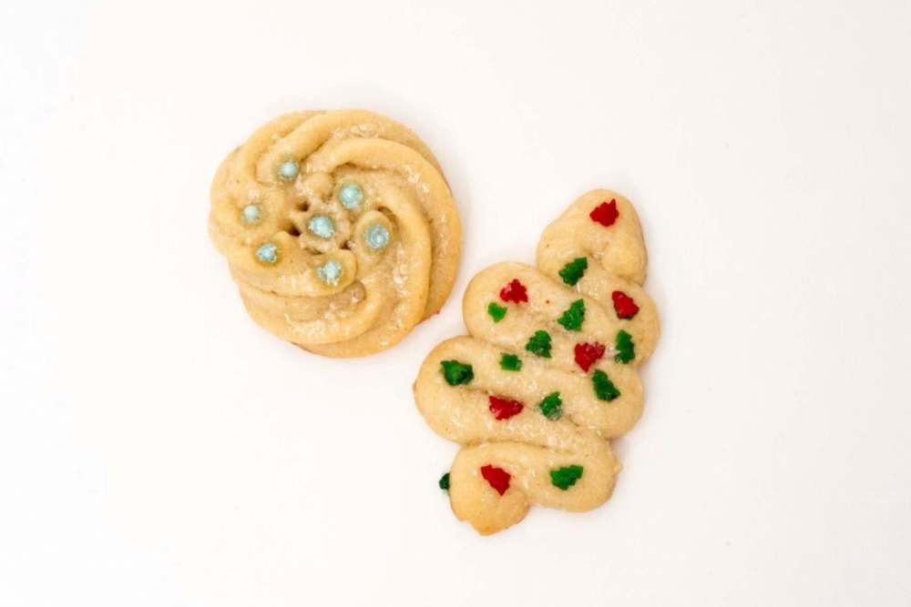 Transfer the dough to a piping bag fitted with a 1/2-inch decorative tip, then pipe directly onto the lined baking sheets into shapes of trees, wreathes, spirals, etc. Sprinkle the cookies with sugar or sprinkles, if desired. Bake for 8 to 12 minutes or until they are lightly browned around the bottom edges. Transfer the cookies to a wire rack to cool completely.