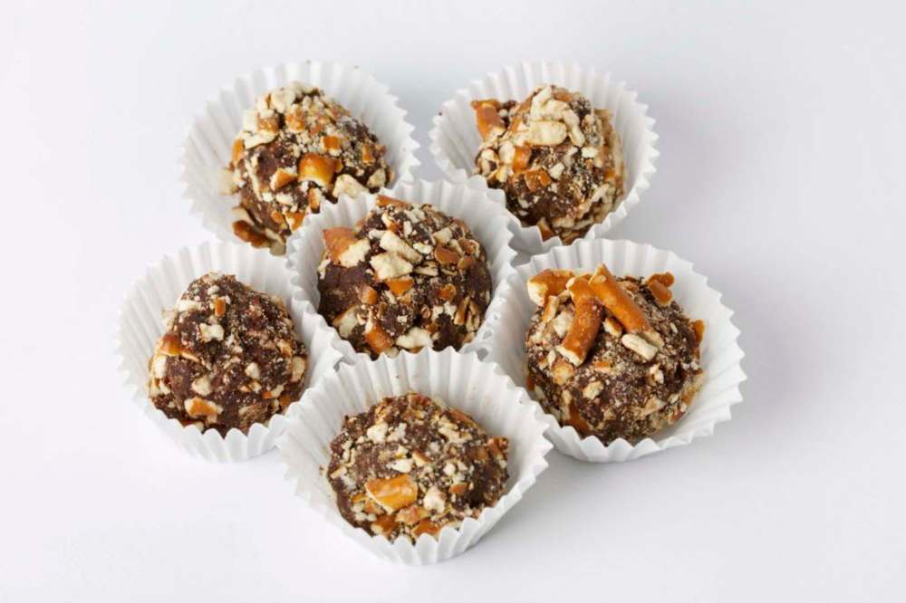 Use a melon baller to scoop out 3-cm (1¼-inch) wide balls of the truffle mixture (14 to 16) then coat each one with the crushed pretzels, arranging the truffles on the small baking sheet. If the truffle mixture becomes soft as you work, pop it back in the refrigerator until it is well chilled again.