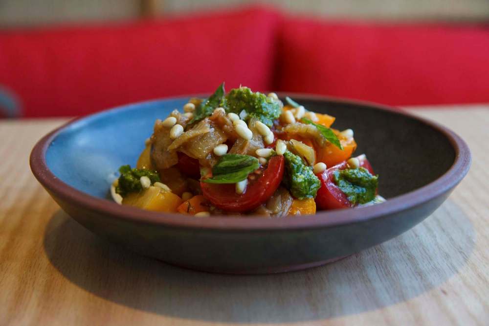 The tomato and goat cheese salad is creamy and tangy, the whipped cheese melting into a kind of dressing for the bursting intensity of local autumn tomatoes, and the caramelized fennel giving a complex finish.