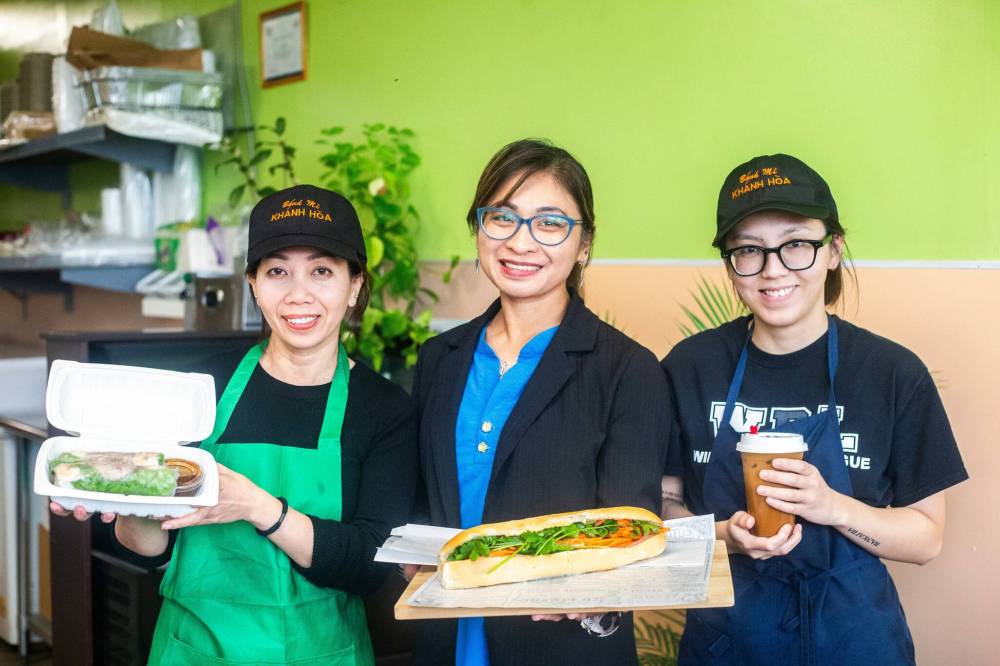 MIKAELA MACKENZIE / WINNIPEG FREE PRESS Owner Kim Le (centre) with employees Jenny Tran (left) and Ngoc Le at Winnipeg's Khanh Hoa, which made the cut for best sandwich in the world on a Guardian List, on Monday.