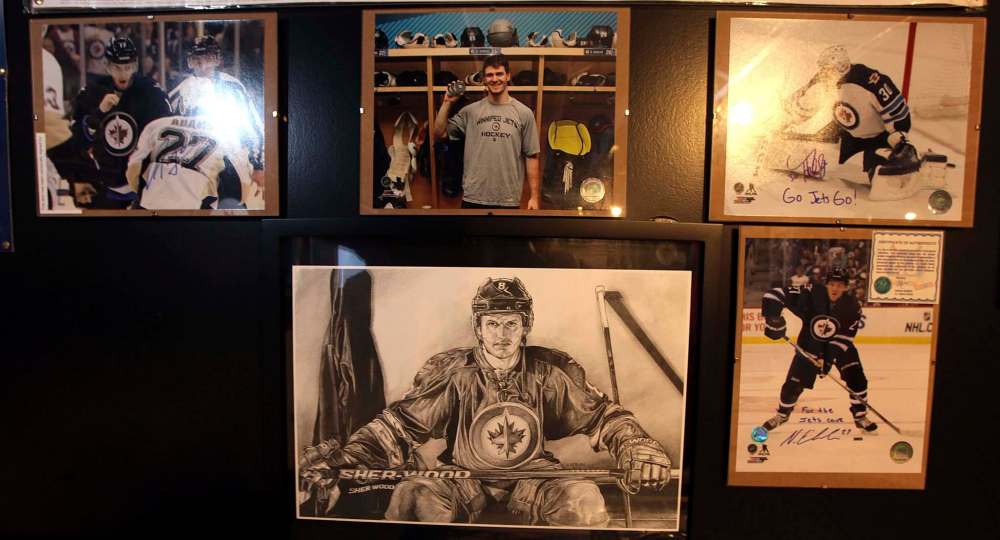 Calder’s 400-square-foot lair is built almost precisely to scale except for the boards, which are 1.2 metres high, the standard set by the NHL. Besides being the perfect environment to enjoy a tilt on the tube or stage an NHL 17 tournament on PlayStation, the room also affords him ample space to display his ever-growing collection of Jets memorabilia. His treasures include autographed 8x10s photos, game-used sticks and pucks, McFarlane action figures and two cases of Fan Brew, a libation that, when it hit liquor store shelves in 2012, was purported to have “bottled up the spirit of Winnipeg Jets fans.”