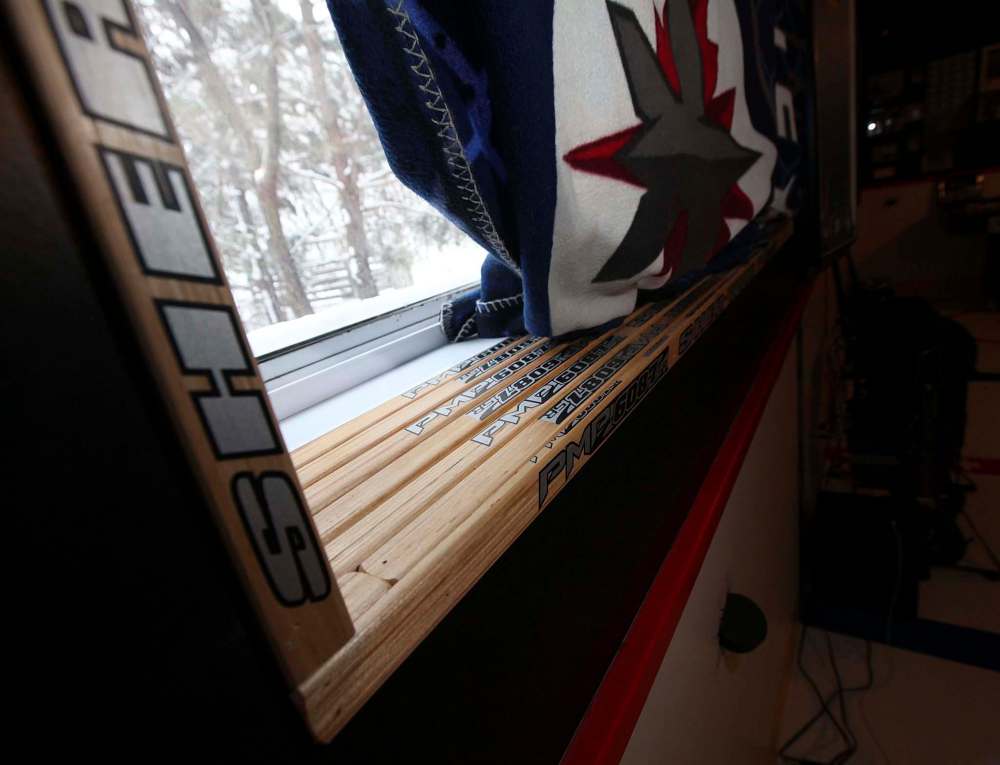 “When I first did the floor I was super-anal about it. If any of my buddies came over and weren’t wearing socks, I made them put on an emergency pair I kept downstairs, before allowing them to step on the ‘ice,’” says Calder, who also successfully tackled the red and blue lines. Since Sobieski has a steadier hand, he enlisted her help for the faceoff circles. “Originally, I didn’t even want anybody to have food or drinks down here to prevent spills. But now that this is our main hangout area, I’ve had to loosen up some.”