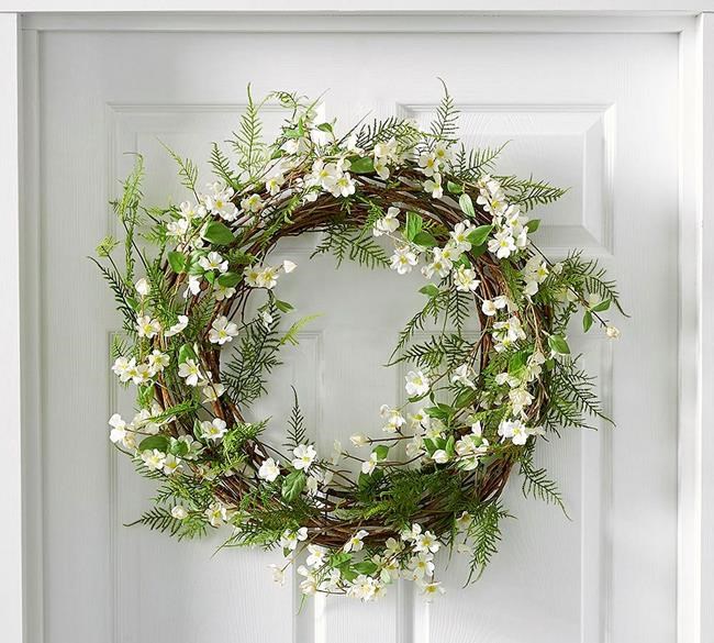 Pottery Barn has a spring wreath with faux white dogwood blossoms — one of the first trees to bloom in spring — nestled among wispy ferns. Another wreath features a soft, grey-green palette with faux silver sage and eucalyptus leaves.