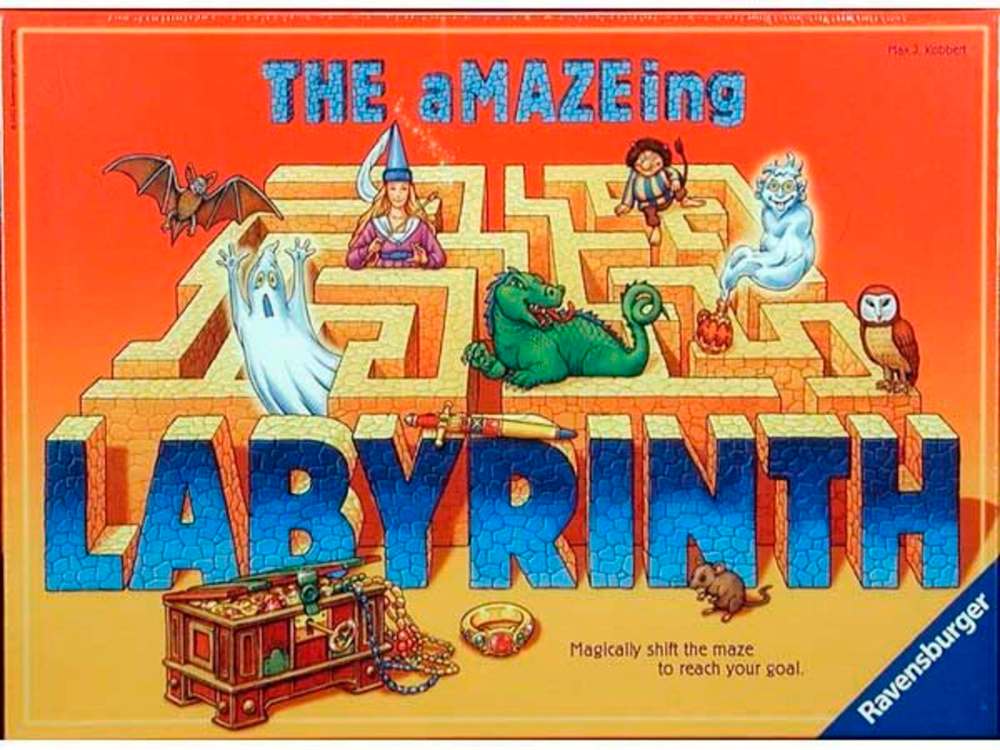 In this charming logic game, the game board has a set of tiles fixed solidly onto it; the remaining tiles that make up the labyrinth slide in and out of the rows created by the tiles that are locked in place. One tile always remains outside the labyrinth, and players take turns taking this extra tile and sliding it into a row of the labyrinth, moving all those tiles and pushing one out the other side of the board; this newly removed tile becomes the piece for the next player to add to the maze. Players move around the shifting paths of the labyrinth in a race to collect various treasures. Whoever collects all his treasures first and returns to his home space wins.