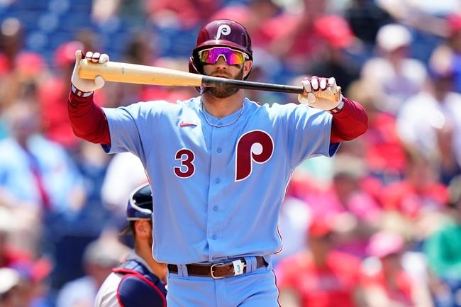 Philadelphia Phillies' Bryce Harper reacts after a strike from Atlanta Braves pitcher Ian Anderson during the third inning of a baseball game, Thursday, June 10, 2021, in Philadelphia. (AP Photo/Matt Slocum)