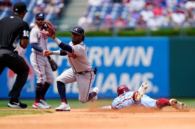 Philadelphia Phillies' Odubel Herrera, right, steals second base past Atlanta Braves second baseman Ozzie Albies during the first inning of a baseball game, Thursday, June 10, 2021, in Philadelphia. (AP Photo/Matt Slocum)