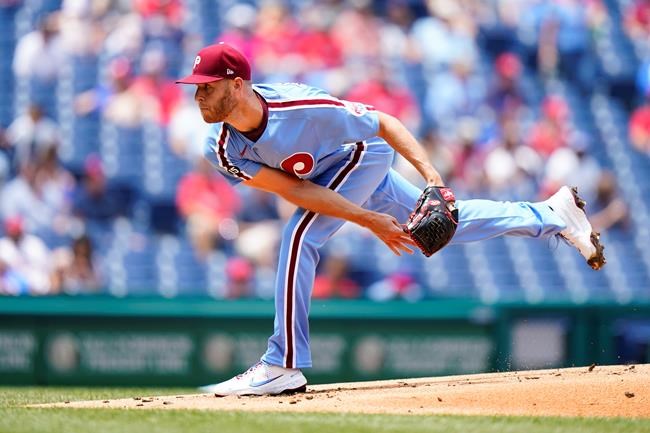 Philadelphia Phillies' Zack Wheeler follows through on a pitch during the first inning of a baseball game against the Atlanta Braves, Thursday, June 10, 2021, in Philadelphia. (AP Photo/Matt Slocum)
