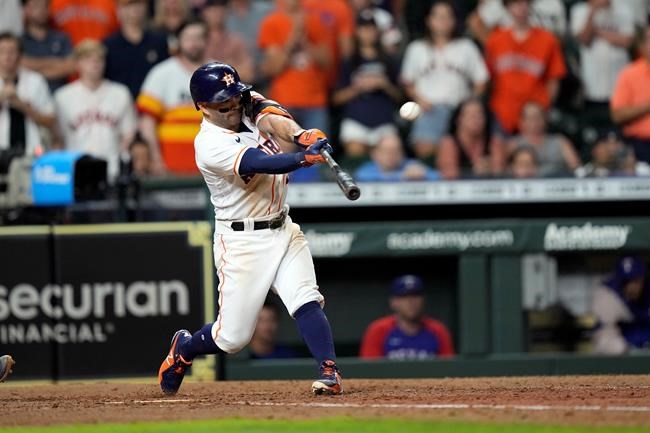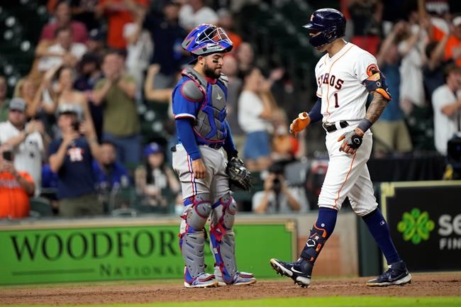 Altuve belted a grand slam and the Houston Astros, saved by Carlos Correa’s tying homer in the ninth, beat the Texas Rangers 6-3.