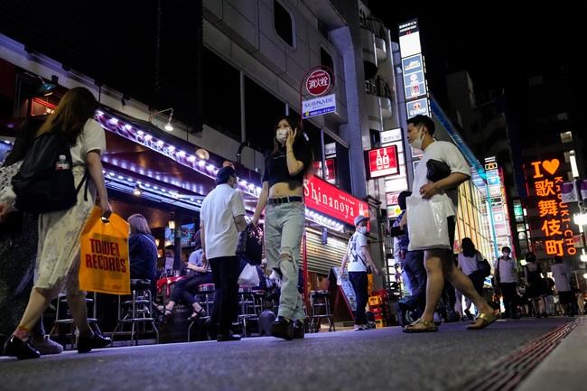 People walk around and gather at a bar after government imposed 8 p.m. closing time for restaurants and bars under Tokyo's fourth state of emergency Saturday, July 17, 2021, in Tokyo. The latest state of emergency has asked restaurants and bars to close by 8 p.m., if not entirely. This has pushed people to drink outside, although many bars remain open and bustling with customers who are defying the rules and expressing frustration and indifference. (AP Photo/Kiichiro Sato)