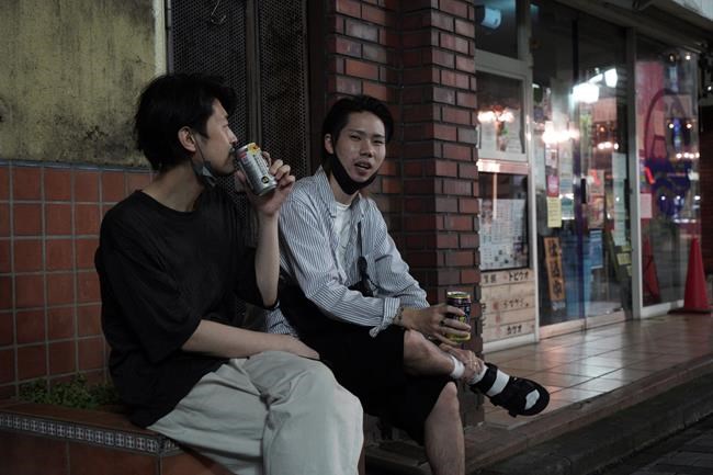 Naoto Suga, right, 25, drinks canned alcohol roadside with his friend in Tokyo’s Shinjuku district Monday, July 19, 2021.