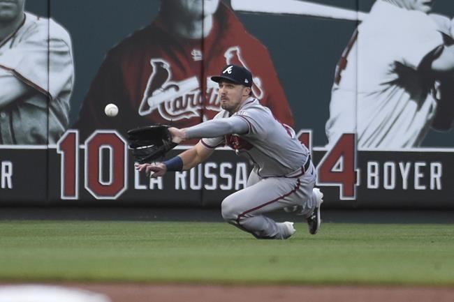 Atlanta Braves left fielder Adam Duvall catches a fly ball hit by St. Louis Cardinals' Yadier Molina during the first inning of a baseball game Wednesday, Aug. 4, 2021, in St. Louis. (AP Photo/Joe Puetz)