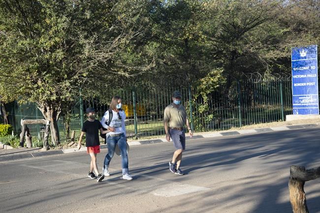Tourists arrive at the entrance of the Victoria Falls in Victoria Falls in this Friday, Aug, 6, 2021 photo. To promote Victoria Falls as a safe destination, President Emmerson Mnangagwa's government has made vaccinations available to all 35,000 residents of the town, and an estimated 60% of the people in Victoria Falls have now been vaccinated with either the Sinopharm or Sinovac vaccines, both from China. (AP Photo/Tichaona Muketiwa)