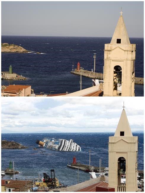 Coast guardsmen placed a wreath of flowers on the dock, and the parish priest led the small group in a moment silent prayer pierced only by fog horns and church bells commemorating the absurdity of the disaster: a stunt ordered up by the captain that ended with 32 people dead and a mammoth cruise ship flopped on its side.