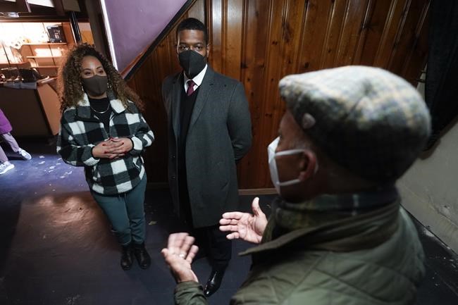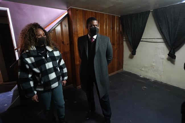 Tilicia Owens and Environmental Protection Agency Administrator Michael Regan, center, listen to Detroit Water and Sewerage Department director Gary Brown in her basement Friday, Feb. 18, 2022, in Detroit. They discussed the city’s $15 million effort to provide flood prevention pumps and other equipment in 11 neighborhoods. Part of the money will come from the $350 billion Coronavirus State and Local Fiscal Recovery Funds which can be used by states, counties and cities to recover from the pandemic and can be used for everything from job creation to child care to housing. (AP Photo/Paul Sancya)