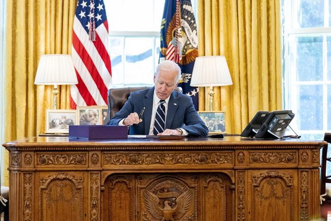 FILE - President Joe Biden signs the American Rescue Plan, a coronavirus relief package, in the Oval Office of the White House, Thursday, March 11, 2021, in Washington. The $350 billion of Coronavirus State and Local Fiscal Recovery Funds are part of the $1.9 trillion American Rescue Plan, and the money is meant to help communities recover from the pandemic and can be used for everything from job creation to child care to housing. (AP Photo/Andrew Harnik, File)