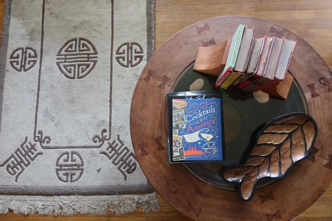 — Certain things were sacrosanct. That hanging mentioned above stayed right where it had been since Lyndon Johnson was president. But the blank wall around it sprouted with our maritally acquired stuff — cabinets from China, a soda-pop crate from 1940s eastern Pennsylvania, a Thai spirit house from our years in Bangkok. The items of a previous generation became centerpieces for the design musings of the next. Similarly, a Chinese throw rug purchased by my parents in 1980 became the perfect accessory for a circular coffee table we got in Thailand — one made by fusing wood to the steel wheel of a massive Thai truck.