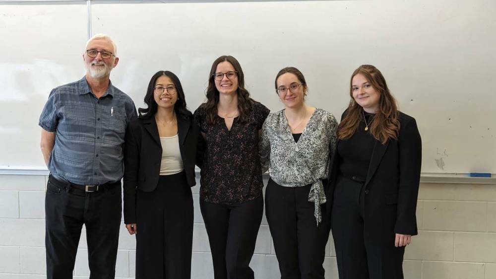 From left: Project adviser Dr. Don Petkau with students Hannah Lubi, Kristen Semenko, Kiara Calista and Jayda Cockwell receiving the CSBE Undergraduate Design Project Award. (Supplied)