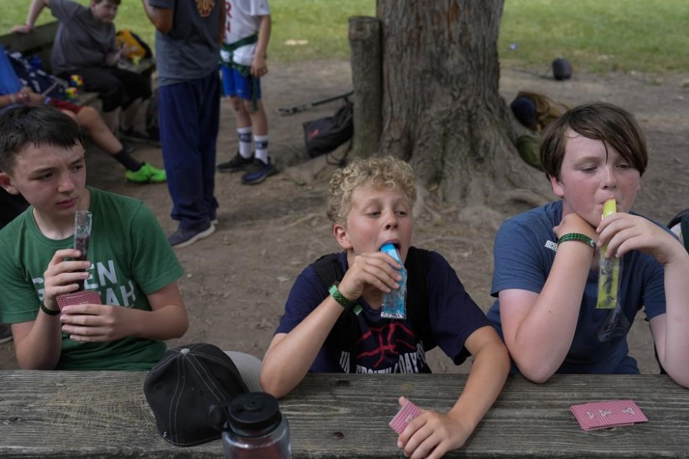 Seeking reprieve, Reiff and his bunkmates have been cranking the air conditioning in their cabin when they’re inside, something kids at other camps in more rustic accommodations across the U.S. don’t have the option of doing. Many kids at Camp Kern have taken to carrying around handmade paper, folding fabric or electric fans. Some campers simply poured water on their heads. And nearly all eagerly rushed forward at the offer of brightly colored popsicles on a day reporters visited.