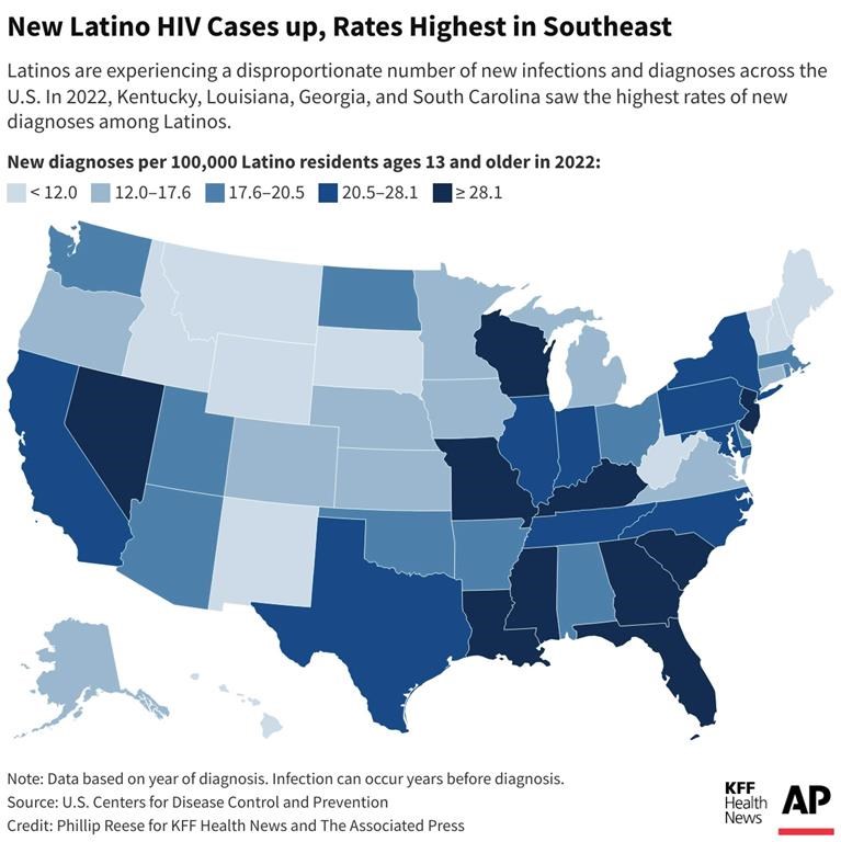 In Shelby County, Tennessee, home to Memphis, the Latino HIV diagnosis rate rose 86% from 2012 to 2022. The health department said it got $2 million in initiative funding in 2023 and while the county plan acknowledges that Latinos are a target group, department director Dr. Michelle Taylor said: “There are no specific campaigns just among Latino people.”