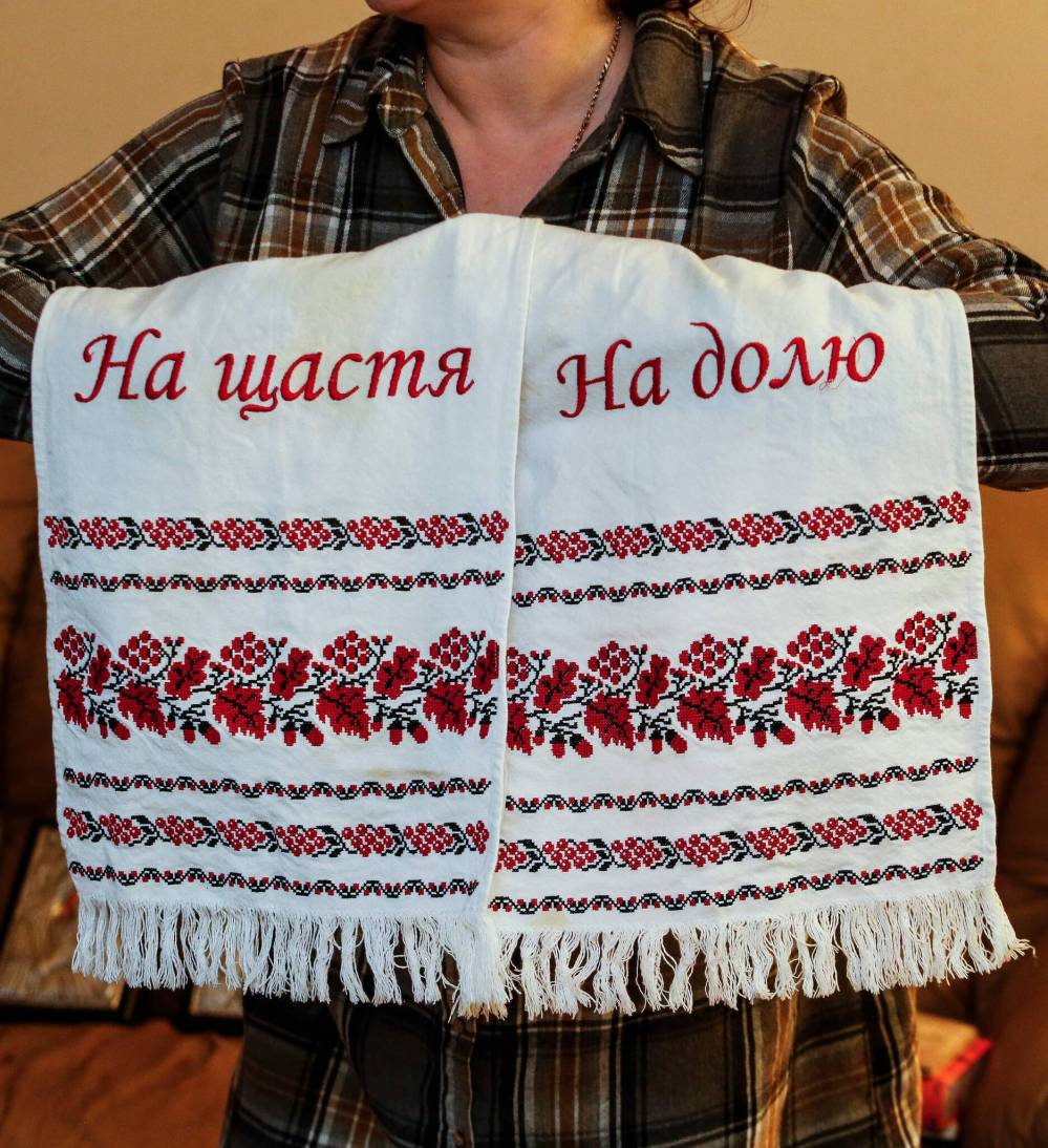 Miroshnyk and Andrii received this rushnyk — a ritual cloth embroidered with traditional Ukrainian patterns and blessings for happiness and good fate — on their wedding day.