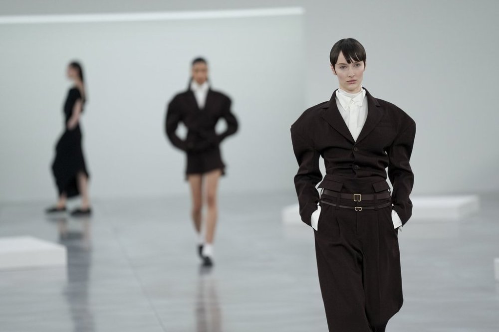 For fall, Satoshi Kondo on Friday embraced ambiguity, blurring the line between sculpture and wearability, structure and fluidity. Designed around the idea of a single piece of cloth, the collection continued Miyake’s legacy of transformation — garments that shift, adapt and invite the wearer to complete them. Inspired by Erwin Wurm’s performative sculptures, the show at Carrousel du Louvre saw models folding, bending, and reshaping their clothes, turning dressing into an act of creation.