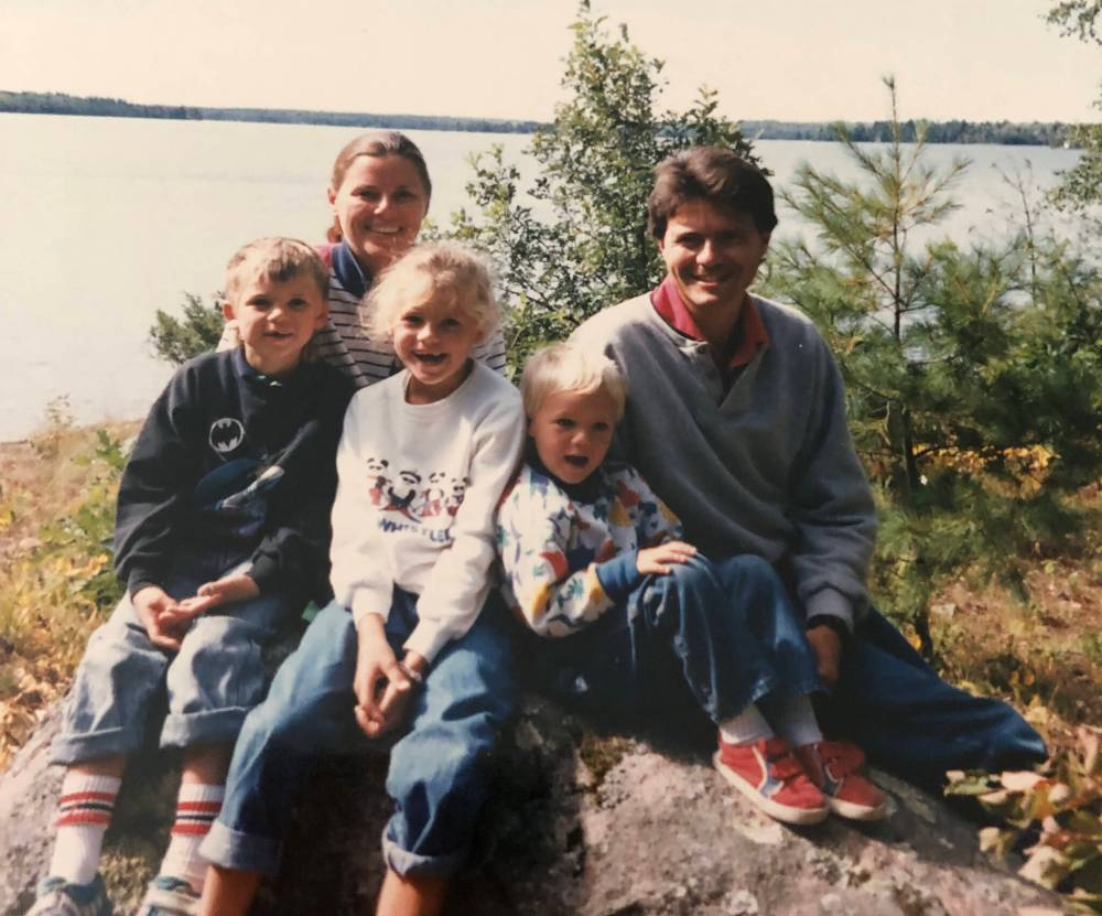 McGarry with his family at their Lake of the Woods cottage in 1991; he and his wife Betty share a boulder with their children Declan, Kate and Connor.