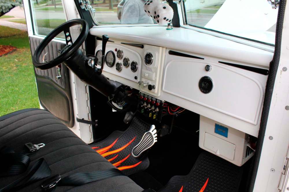 The truck cab and box is finished in bright white and accented with a black and grey graphic. Bumpers are custom made nerf bar style fabricated by Chevrier Welding and chrome plated by Riverview Plating. A custom polished diamond-plate container was fabricated for the box, to hold the spare tire, jack, gas can and tool box. A new Ron Francis 12-volt wiring kit eliminated the old six-volt wire harness. Up front, Queen Bee headlights and turn signals from a Harley-Davidson motorcycle mount to the fenders. In the back, there’s dual brake lamps and backup lamps. Dual chrome side-view mirrors are mounted on the doors and the truck received new tinted glass.