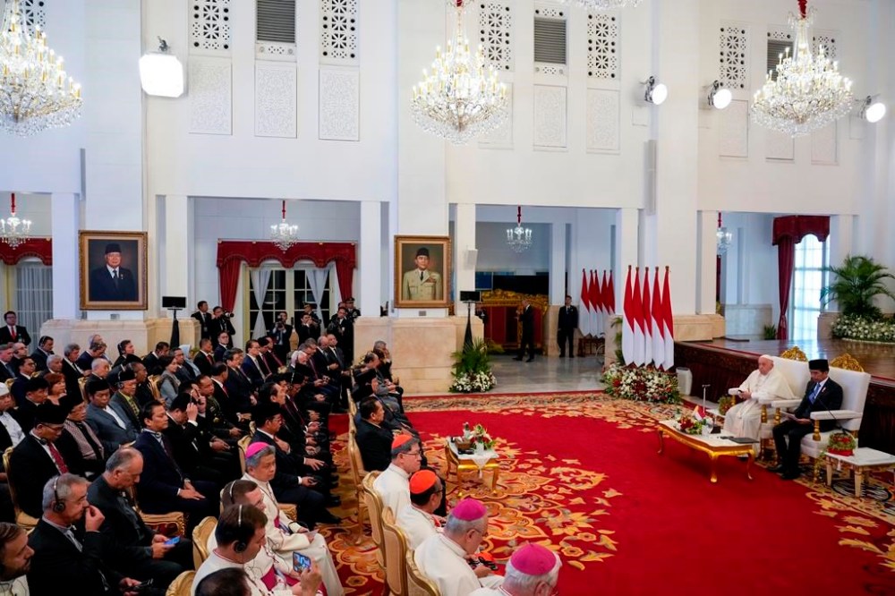 In his remarks to officials, Francis compared Indonesia’s human diversity to the archipelago’s 17,000 islands. He said each one contributes something specific to form “a magnificent mosaic, in which each tile is an irreplaceable element in creating a great original and precious work.”