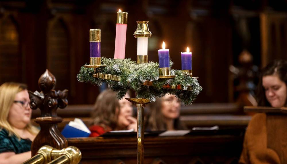A choir waits for the next song behind an Advent wreath. (John Woods / Free Press)