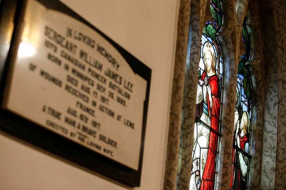 Stained glass beside a memorial plaque at Holy Trinity Anglican Church (John Woods / Free Press)