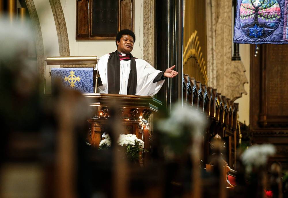 Rev. Naboth Manzongo speaks to parishioners during the service. (John Woods / Free Press)