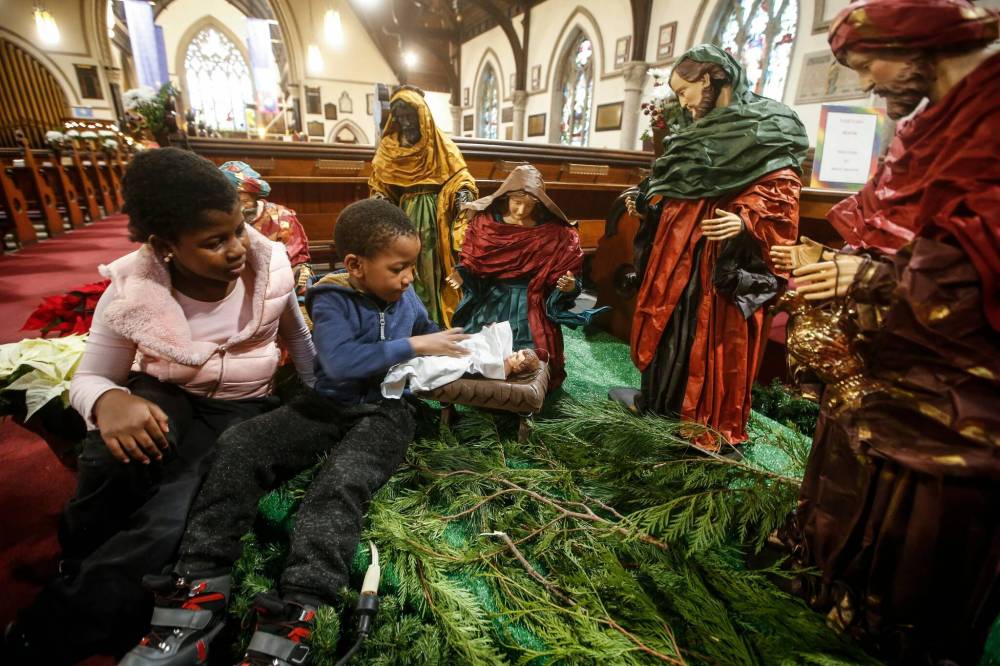 Emily Manzongo, 11, and her brother Ngoni, 6, place a baby Jesus figurine into a creche after a service at Holy Trinity Anglican Church Sunday. (John Woods / Free Press)