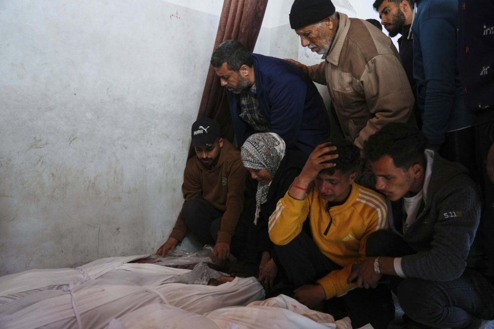 Palestinians mourn over the bodies of their relatives killed by an Israeli airstrike in the Netzarim corridor, at the Al-Ahli Hospital in Gaza City on Tuesday, March 11, 2025. (AP Photo/(AP Photo/Jehad Alshrafi)