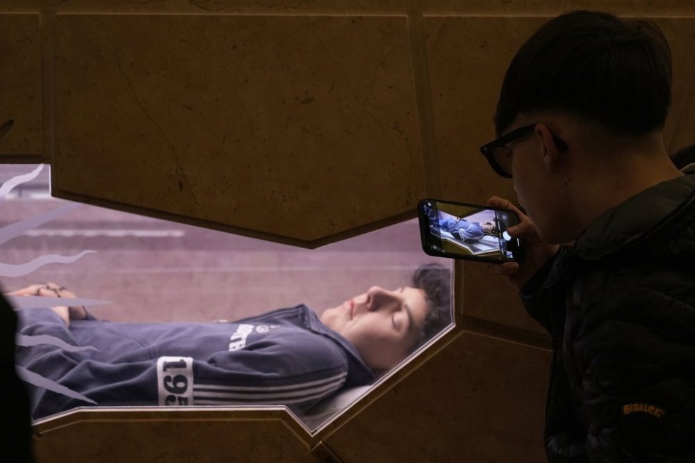 A teenager uses a smartphone to take a picture at the tomb of 15-year-old Carlo Acutis, an Italian boy who died in 2006 of leukemia, in Assisi, Italy, on Saturday, March 1, 2025. (AP Photo/Gregorio Borgia)