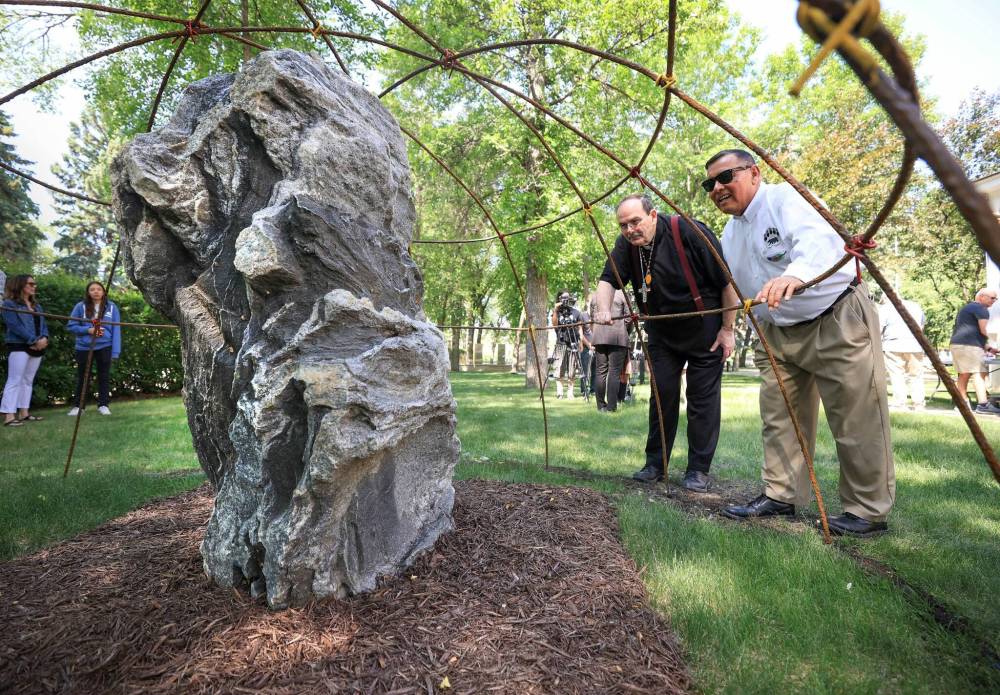 The 1.5-metre-tall M’shoomis Asin, or grandfather rock, was donated to the archdiocese by a parishioner five years ago. The symbolic sweat lodge was welded by students at Murdoch MacKay Collegiate.